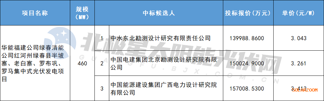 2月10日,华能福建公司绿春清能公司红河州绿春县半坡寨、老白寨、罗布巩、罗马集中式光伏发电项目EPC招标候选人公示,入围企业有3家:中水东北勘测设计研究有限责任公司、中国电建集团北京勘测设计研究院有限公司、中国能源建设集团广西电力设计研究院有限公司,投标单价3.043~3.413元/W。