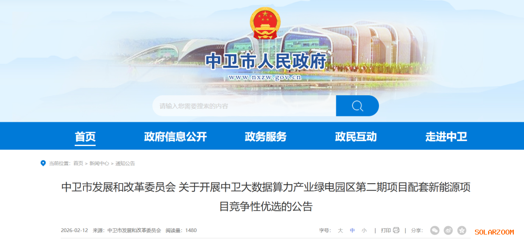 2月12日,宁夏中卫市发改委发布《关于开展中卫大数据算力产业绿电园区第二期项目配套新能源项目竞争性优选的公告》。