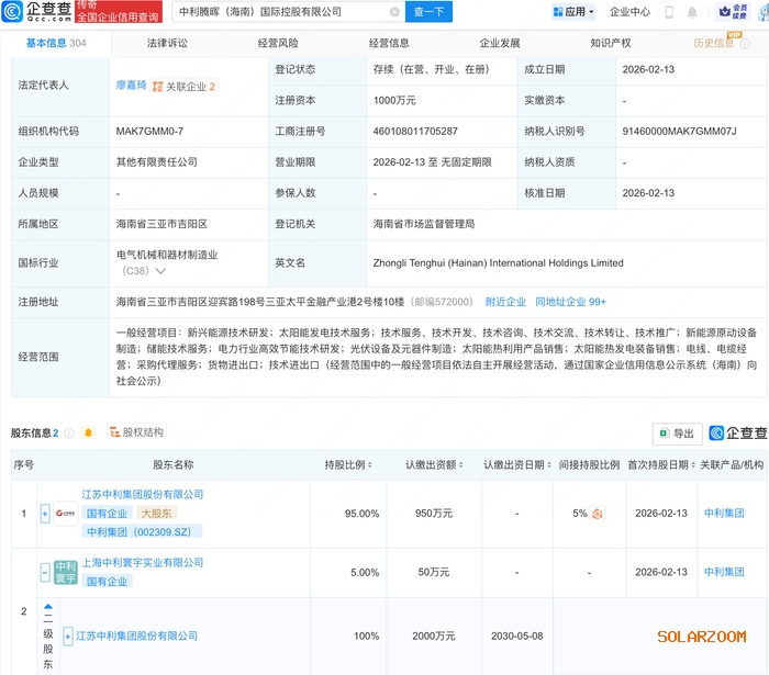 企查查APP显示,近日,中利腾晖(海南)国际控股有限公司成立,注册资本1000万元,经营范围包含:电力行业高效节能技术研发;光伏设备及元器件制造;太阳能热利用产品销售等。企查查股权穿透显示,该公司由中利集团(002309.SZ)间接全资持股。