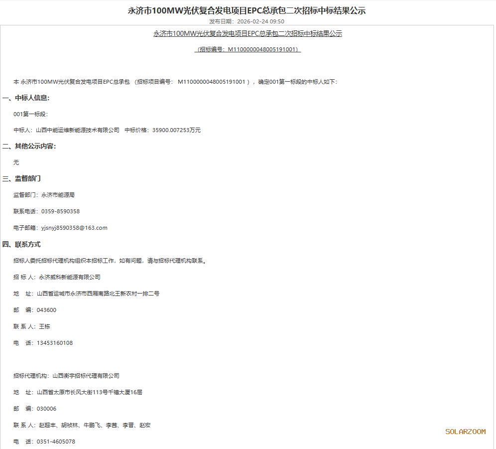 2月24日,永济市100MW光伏复合发电项目EPC总承包二次招标中标结果公示。
