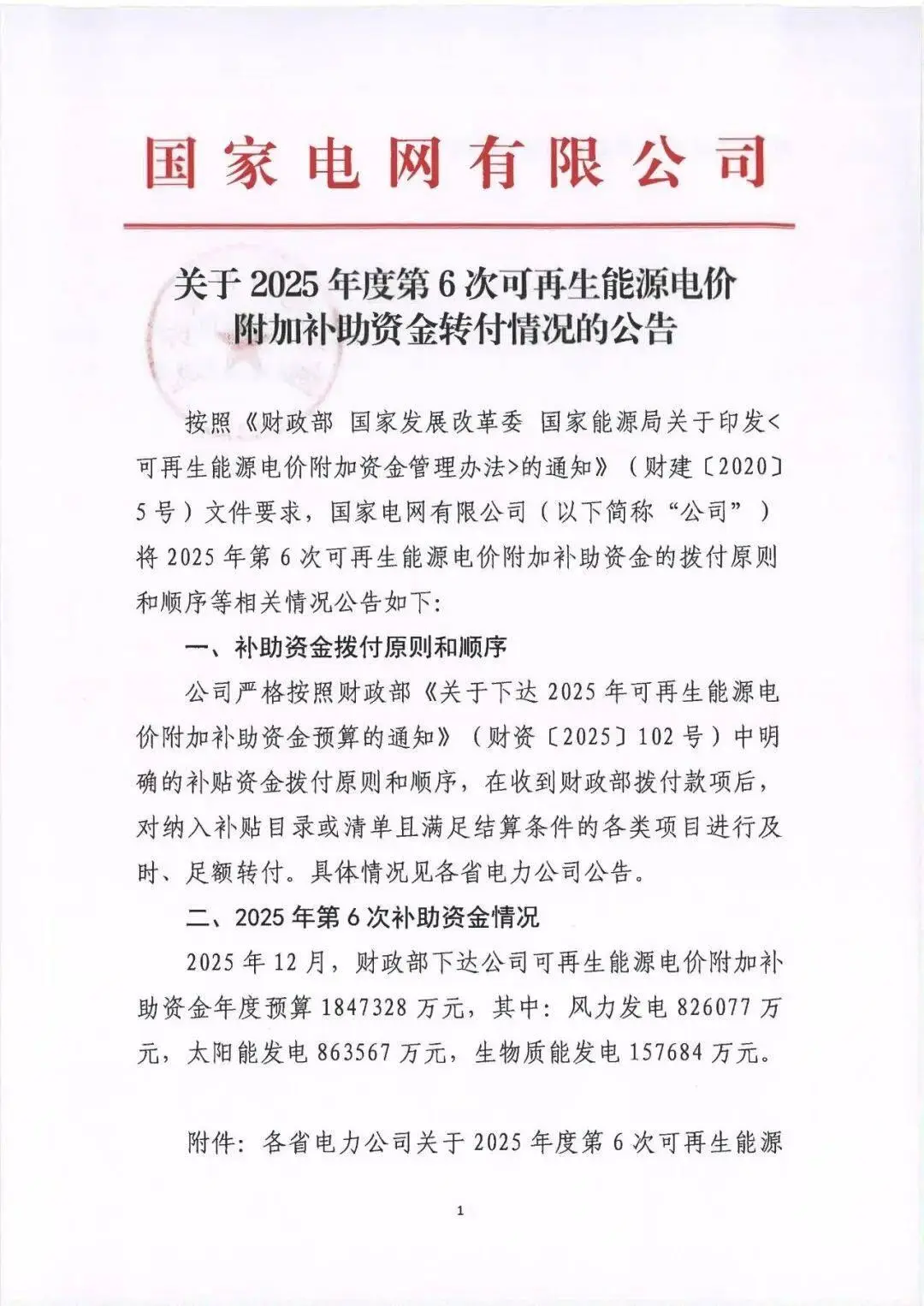 国家电网发布2025年度第6次可再生能源电价附加补助资金转付情况
