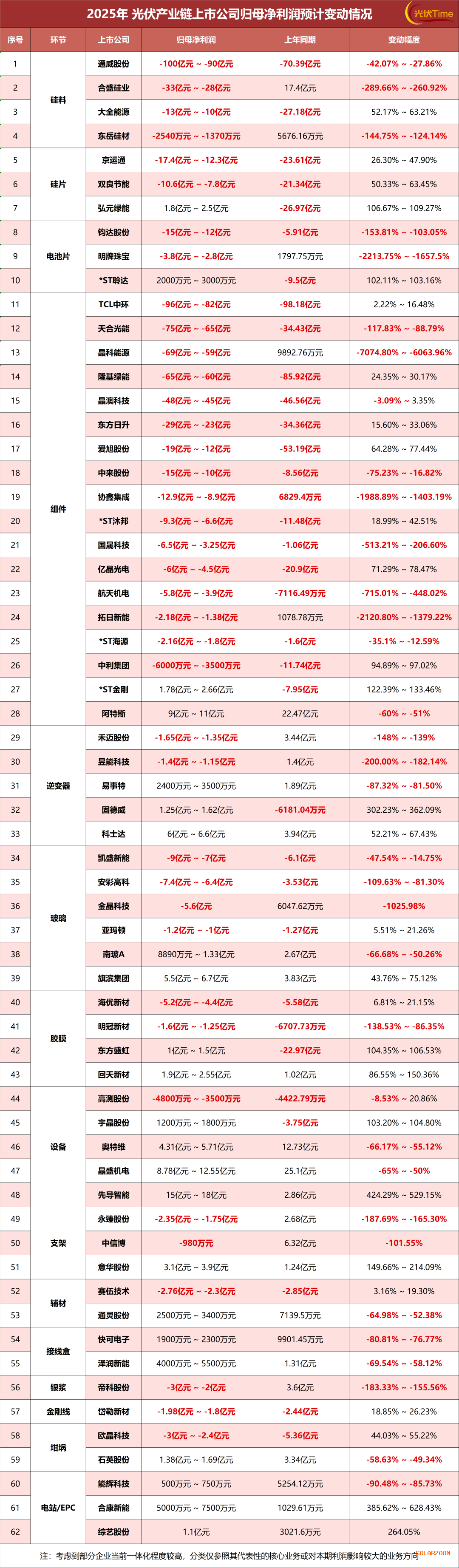 作为产业链起点的硅料环节,2025年亏损全面加剧,通威股份(18.160, 0.00, 0.00%)(600438)、合盛硅业(51.200, -1.37, -2.61%)(603260)、大全能源(23.830, -0.55, -2.26%)(688303)等头部企业均陷巨额亏损。最高达到百亿的天价预亏,直接将TCL中环(10.250, -0.18, -1.73%)(002129)从行业“亏损王”的位置上挤了下来。