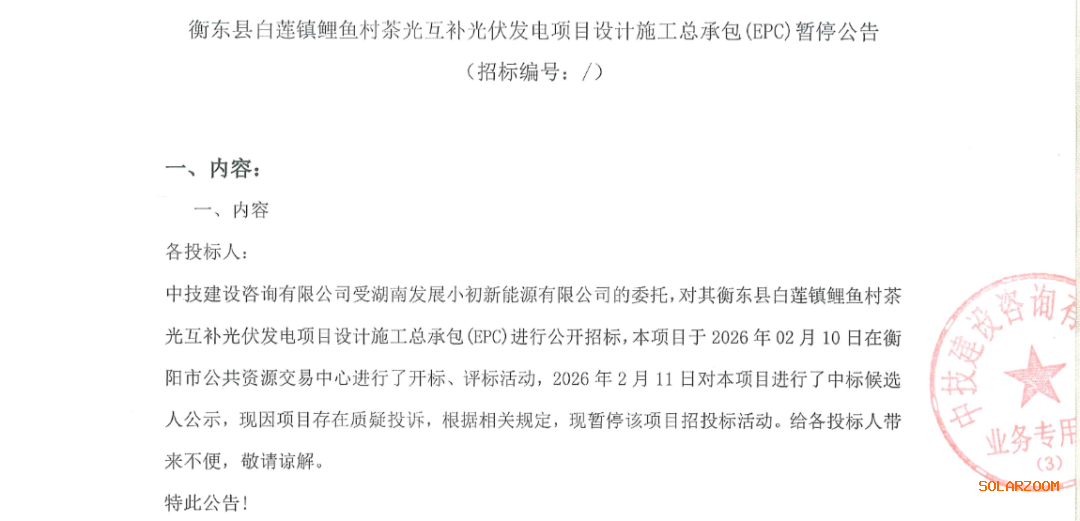 2月26日,衡东县白莲镇鲤鱼村茶光互补光伏发电项目设计施工总承包(EPC)暂停公告发布。
