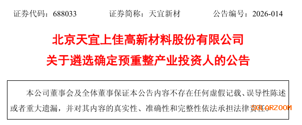 3月2日,天宜新材发布关于遴选确定预重整产业投资人的公告。