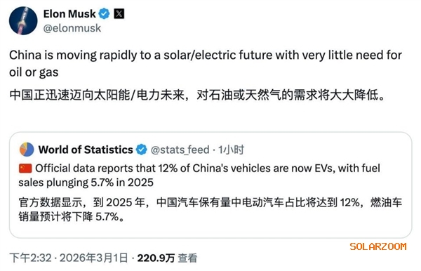 近日,特斯拉CEO埃隆・马斯克在社交平台公开表示:“中国正迅速迈向太阳能/电力未来,对石油或天然气的需求将大大降低”。