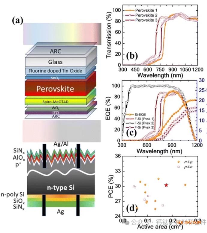 串联装置采用顶部钙钛矿电池,基底为玻璃,电子传递层(ETL)由二氧化锡制成(SnO2),钙钛矿吸收层,spiro-MeOTAD空穴输运层(HTL)、作为顶层透明电极(TE)的氧化铟锌(IZO)层,以及银(Ag)金属栅极。