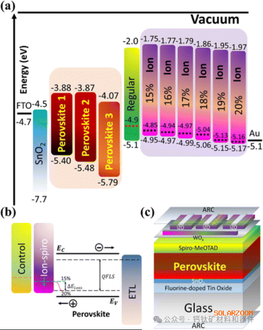 据报道,离子调制、自由基掺杂的spiro-MeOTAD HTL可通过4-叔丁基-1-甲基吡啶双(三氟甲烷磺酰)酰亚胺(TBMPTFSI)盐调制实现最佳功函数调谐,提升稳定性。与分子结构工程用于能级调整不同,该方法提供了更简单、更可控的能级对齐和减少界面缺陷的方法。