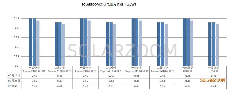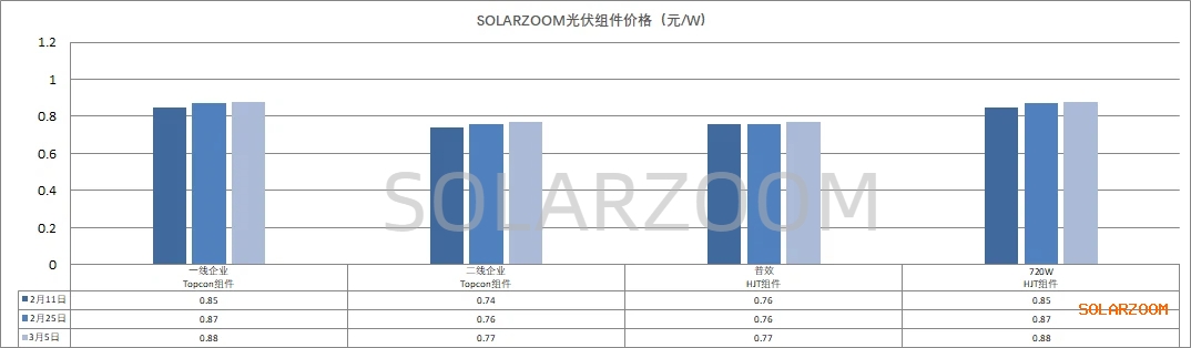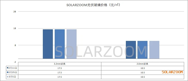 辅材方面,部分辅材虽因过年而库存增加,但现有成本压力下已无下跌空间,光伏玻璃价格2.0mm维持在10.5元/㎡左右,3.2mm光伏玻璃价格维持在17.5元/㎡左右。