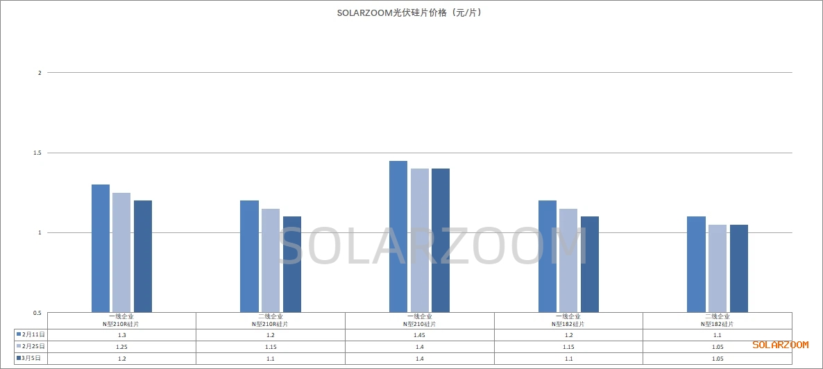 本周国内硅片价格延续跌势,各尺寸硅片价格小幅阴跌。M10L、G12R、G12硅片价格相比上周下跌0.05元/片左右,主流价格分别来至1.05-1.1、1.1-1.15、1.35-1.4元/片区间,实际成交趋于价格区间低位,且个别尺寸也有更低价格出现。年后下游电池环节虽已在复产,但短期尚有硅片库存的情况下采购积极度有限,而硅片自身环节库存居高不下,上游硅料价格的跳水降价也使得下游电池端对硅片价格有降价预期,观望情绪增加。供需方面,3月硅片产能排产因天数增加而产出整体增加,短期库存压力仍将不小,后期硅片库存能否顺利消化还需视下游电池复产进度对硅片采购需求而看;预计短期硅片价格也在上游硅料价格持续走弱、硅片库存压力不减的情况下难有太大反弹。HJT硅片方面,下游HJT电池有产线陆续开线,对应HJT硅片需求有提升,HJT半片价格近期价格虽有小幅下调但幅度有限,HJT半片硅片成交价格在0.7元/片左右。