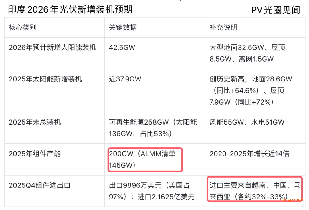 研究分析机构JMK Research发布的《2025年第四季度(10-12月)印度可再生能源更新报告》显示,预计2026年印度将新增42.5GW太阳能装机容量。