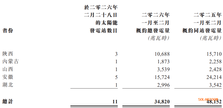 3月6日,江山控股(00295)发布公告,2026年1月至2月期间,公司拥有的太阳能发电站总发电量约为3.48万兆瓦时,较去年同期的4.82万兆瓦时下降了27.8%。截至2026年2月28日,公司总装机量为290兆瓦。