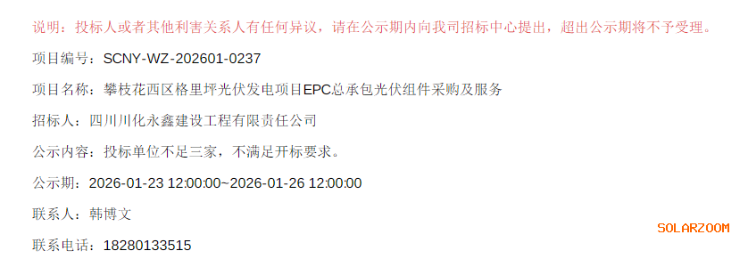 3月2日,攀枝花西区格里坪光伏发电项目EPC总承包光伏组件采购及服务终止公告,招标人为四川川化永鑫建设工程有限责任公司。公告显示,截止开标时间,无投标单位递交投标文件,不满足开标要求,故流标。