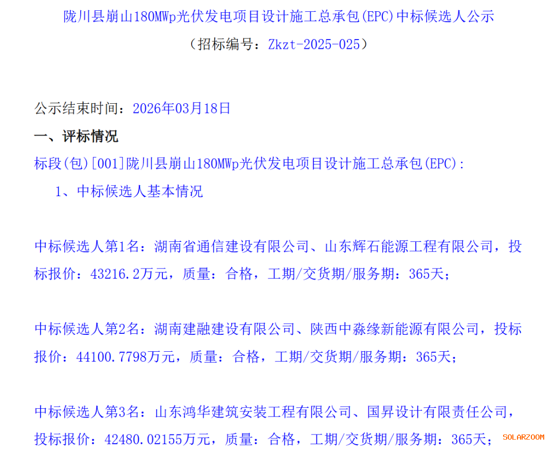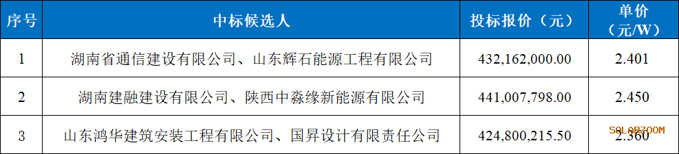 根据中标候选人公示,项目投标单价2.36~2.45元/W,其中,湖南省通信建设有限公司、山东辉石能源工程有限公司以2.401元/W单价获第一中标候选人,具体如下: