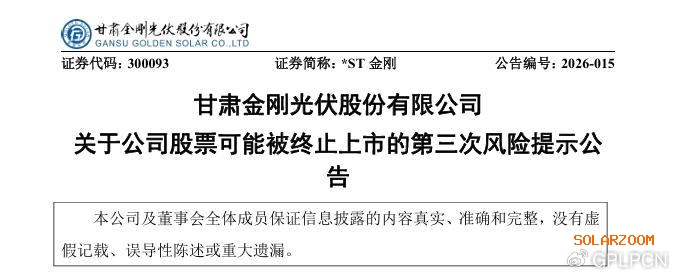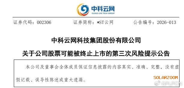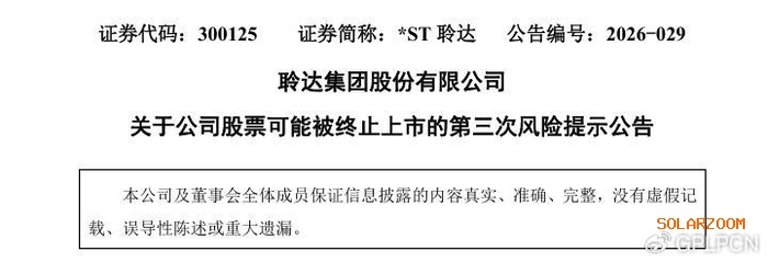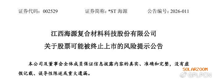 3月9日,*ST聆达(300125.SZ)、*ST金刚(300093.SZ)、*ST海源(002529.SZ)、*ST云网(002306.SZ)4家光伏跨界上市公司发布关于股票可能被终止上市的风险提示公告。其中,*ST海源为首次发布可能被终止上市的风险提示公告,另外3家为第3次发布风险提示公告。