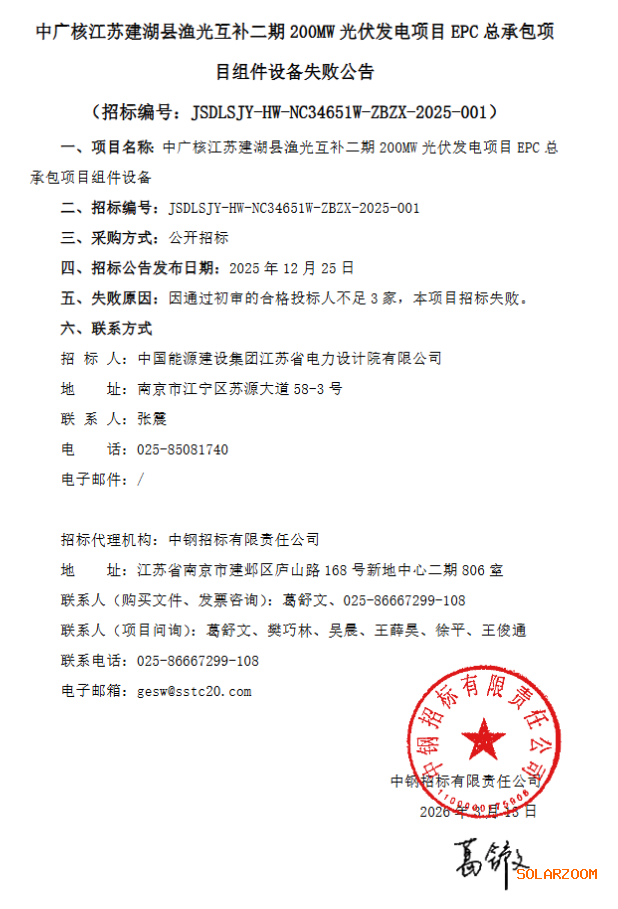 3月13日,中广核江苏建湖县渔光互补二期200MW光伏发电项目EPC总承包项目组件设备失败公告公示。