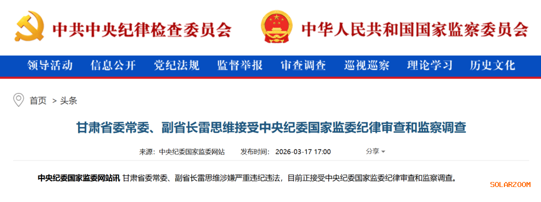 3月17日,中央纪委国家监委网站发布消息称,甘肃省委常委、副省长雷思维涉嫌严重违纪违法,目前正接受中央纪委国家监委纪律审查和监察调查。