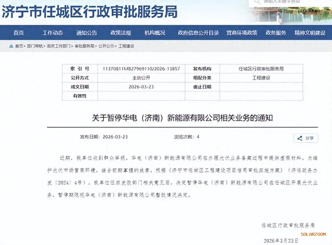 3月23日,济宁市任城区行政审批服务局发布《关于暂停华电(济南)新能源有限公司相关业务的通知》,决定暂停华电(济南)新能源有限公司(简称“华电济南新能源”)在任城区开展光伏业务,暂停期限视其整改情况而定。