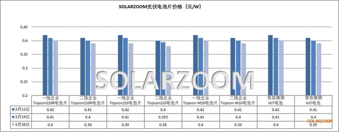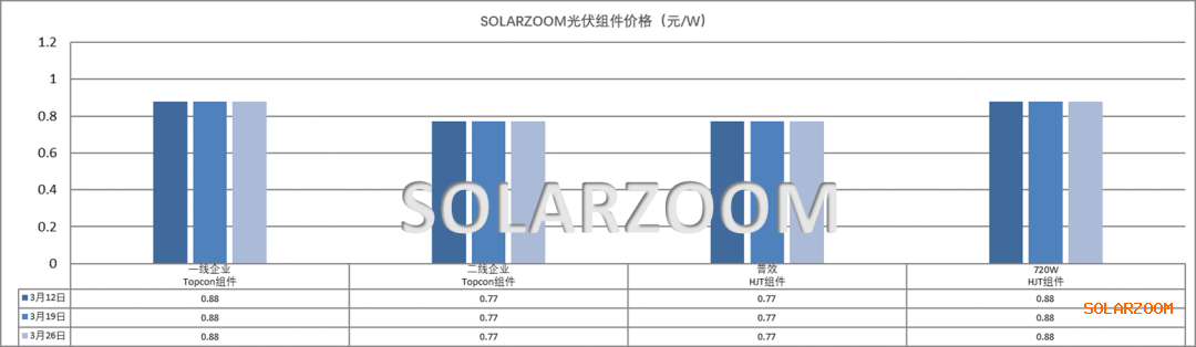 电池:本周国内电池价格未能止跌企稳,各类尺寸电池价格继续下跌0.01-0.02元/W区间。近期银价继续跳水,银点价格来至17500元/公斤附近,电池成本继续下降;而本月电池排产供给明显上升,终端需求尚未有明显起色下,电池价格难以稳住,本周各尺寸电池价格基本已经来至0.4元/W以下,各尺寸电池主流价格来至0.38-0.395元/W区间,各低价格也已有报出。对于后市电池价格,市场情绪整体偏悲观,预计仍有下行可能;而随着价格持续下行,同时出口退税补贴取消带来的抢出货结束,短期电池尚无明显需求支撑,下月市场上部分电池企业的排产上预计将收缩下滑,以此来维稳价格。HJT电池方面,节后下游陆续有HJT订单需交付,在产的HJT电池企业排产略有提产,但HJT电池生产规模仍不大;价格方面,HJT电池价格随市下滑,HJT电池来至0.37-0.4元/W。