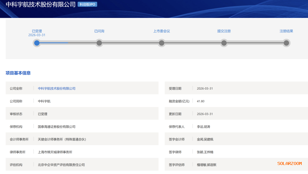 3月31日,据上交所官网显示,中科宇航技术股份有限公司(以下简称“中科宇航”)科创板IPO获受理,保荐机构为国泰海通,本次IPO拟募资41.8亿元。