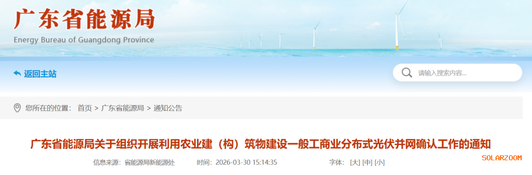 3月30日,广东省能源局发布《关于组织开展利用农业建(构)筑物建设一般工商业分布式光伏并网确认工作的通知》,支持依托农业建(构)筑物(包括农业大棚、畜牧或禽类养殖场、渔业设施等)建设的、已于2025年1月23日及以前完成备案、于2025年12月31日及以前获得电网企业支持并网意见的一般工商业分布式光伏发电项目并网,且不对年自发自用电量比例作要求。