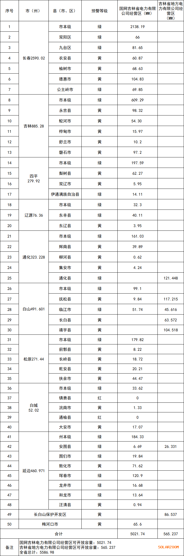 根据公示,吉林省12个市(州),48个县(市、区)可开发容量共计5586.98MW。其中,国网吉林电力有限公司经营区可开放容量5021.74MW,吉林省地方电力有限公司经营区可开放容量565.237MW。