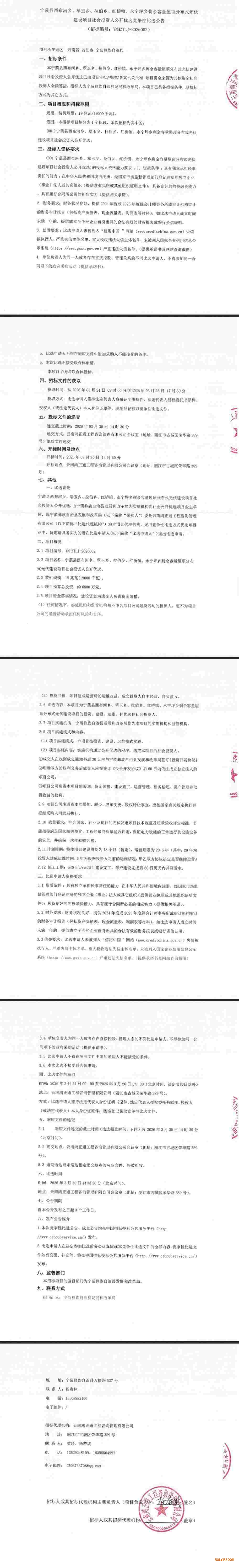 近日,云南省宁蒗县西布河乡、翠玉乡、拉伯乡、红桥镇、永宁坪乡剩余容量屋顶分布式光伏建设项目社会投资人公开优选竞争性比选公告发布。