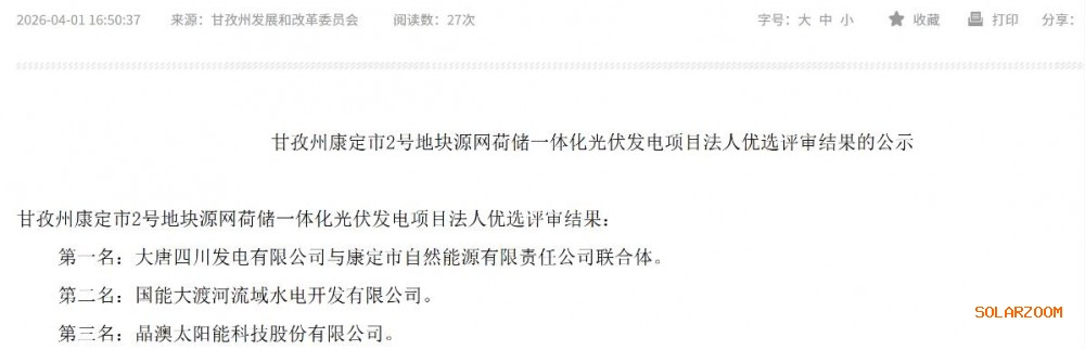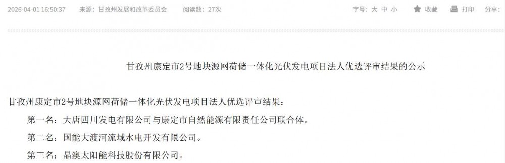 4月1日,甘孜藏族自治州发展和改革委员会发布甘孜州康定市2号地块源网荷储一体化光伏发电项目法人优选评审结果的公示。
