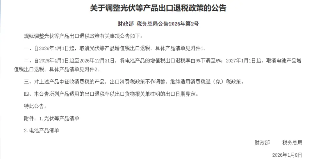 自今年4月1日起,光伏等产品增值税出口退税将取消,这意味着短期内将直接抬升企业出海销售成本,压缩利润空间,但中长期看,将推动中国光伏企业的新一轮洗牌,靠退税生存的企业将被淘汰,市场格局将走向新一轮出清和分化。