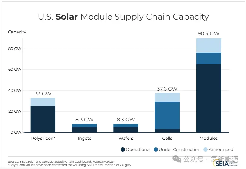 据美国太阳能行业协会(SEIA)今年2月的最新数据,美国本土光伏组件制造产能已达65.1GW,较四年前狂飙超700%,但实际产量仍低于本土市场需求。