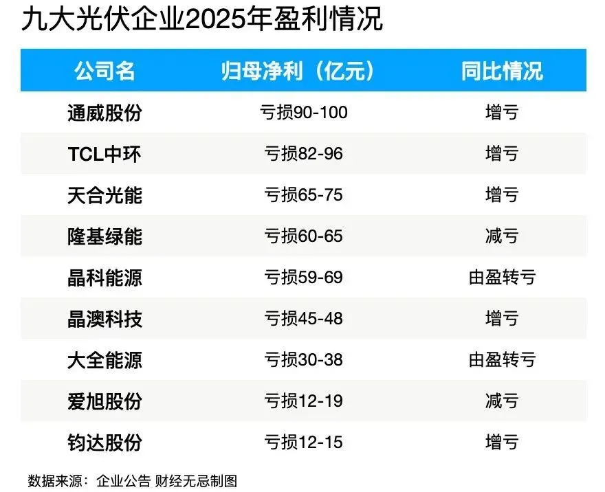 据「财经无忌」不完全统计,包括通威股份(600438.SH)、TCL中环(002129.SZ)、天合光能(688599.SH)等九大光伏龙头合计亏损超500亿元,“卖得越多、亏得越狠”的困境并没有得到缓解。