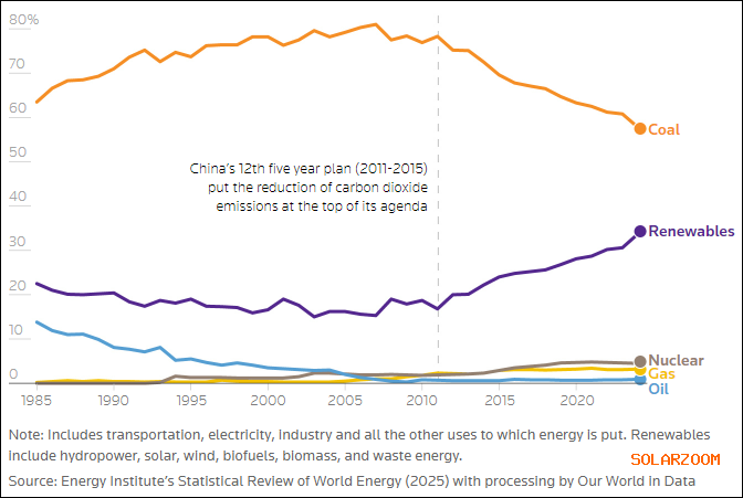 中国电力生产来源占比。2010年后,煤炭(橙色)明显开始下降,可再生能源(紫色)明显上升。 路透社制图