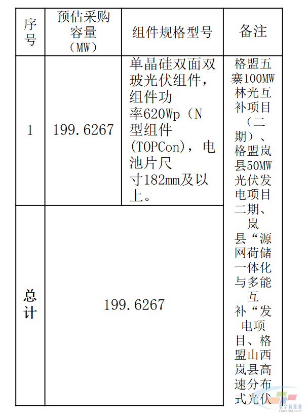 2026年1月28日,山西国际能源集团新能源投资管理有限责任公司2026年度光伏组件集中采购项目发布招标公告,招标预估容量为199.6297MW,为山西国际能源集团新能源投资管理有限责任公司所属企业投资或城建项目所需光伏组件采购。