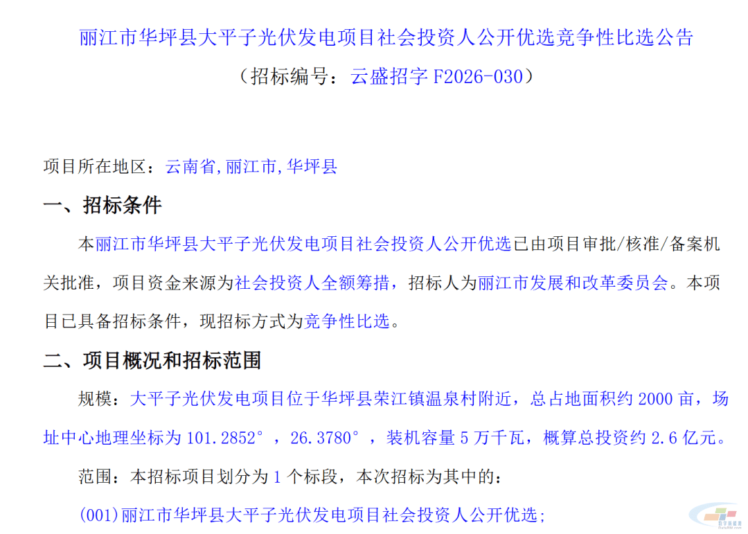 4月7日,云南省丽江市华坪县清水河光伏发电项目和丽江市华坪县大平子光伏发电项目分别发布社会投资人公开优选竞争性比选公告,招标人为丽江市发改委。