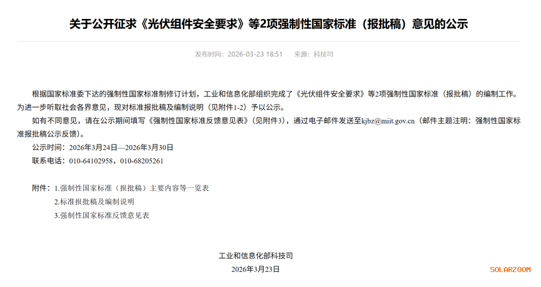 再往前推一周,工信部公示了两项关于光伏组件的强制性国家标准;3月1日,生态环境部的光伏设备回收新规正式生效。