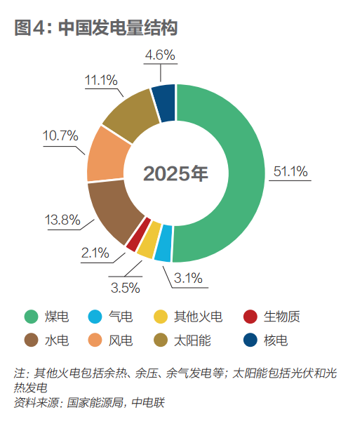 与大比例依赖进口供应的油气资源不同,中国电力的本土供应能力可以几乎完全覆盖需求。煤电仍是重要基荷电源,2025年占全口径发电量51.1%;包括水电、风电、太阳能、核电和生物质发电在内,非化石能源发电量已占总发电量的42.9%;并且新增的可再生能源发电量,已经能全部覆盖全社会用电增量。受本土资源禀赋限制和能源安全考虑,天然气主要用于城市燃气和供暖、工业燃料、调峰电源,发电占比一直较小,约占发电量的3%。