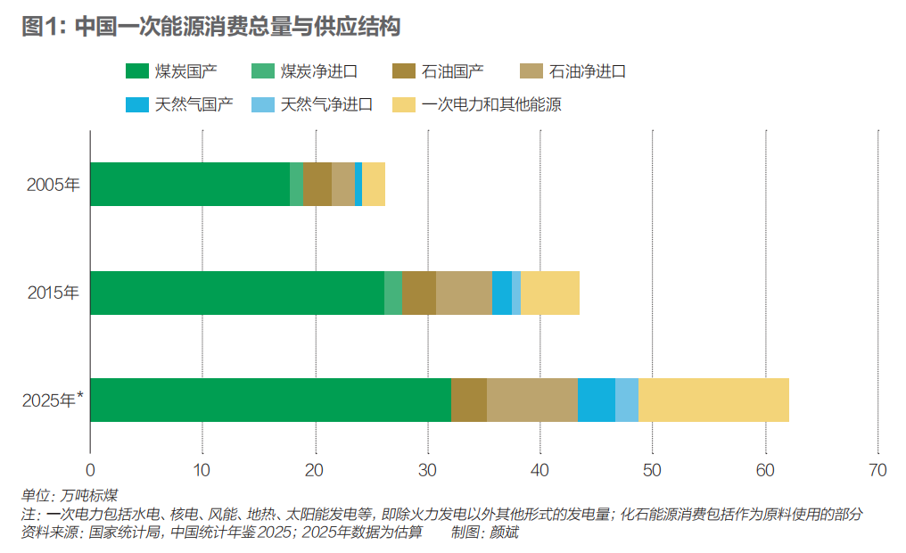 尽管中国的进口石油占比较大,但整体能源结构以“煤电+可再生能源”为主。2025年,石油和天然气分别占中国能源总消费的18.2%和8.7%,其中各有约73%和38%来自进口。煤炭和非化石能源占全国能源总消费的73%,全部由本土供应满足;加上国产原油和天然气,中国整体的能源自给率接近84%。