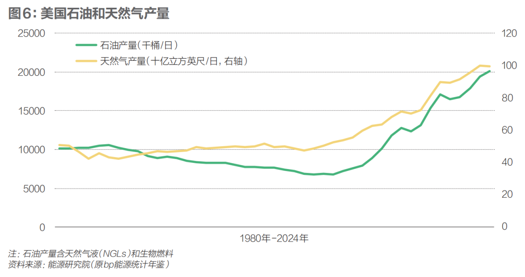 自2007年-2008年高油价期间爆发页岩革命后,美国油气产量从2009年开始快速增加。2014年,美国石油产量超过沙特,首次成为全球石油产量最高的国家;因此将国际油价中枢从100美元/桶上下,拉低至50美元-60美元/桶。2025年,美国原油产量占全球近20%,几乎是沙特和俄罗斯产量之和;天然气的增长曲线类似,同年产量占全球27%,排名第二的俄罗斯仅占全球的15%。