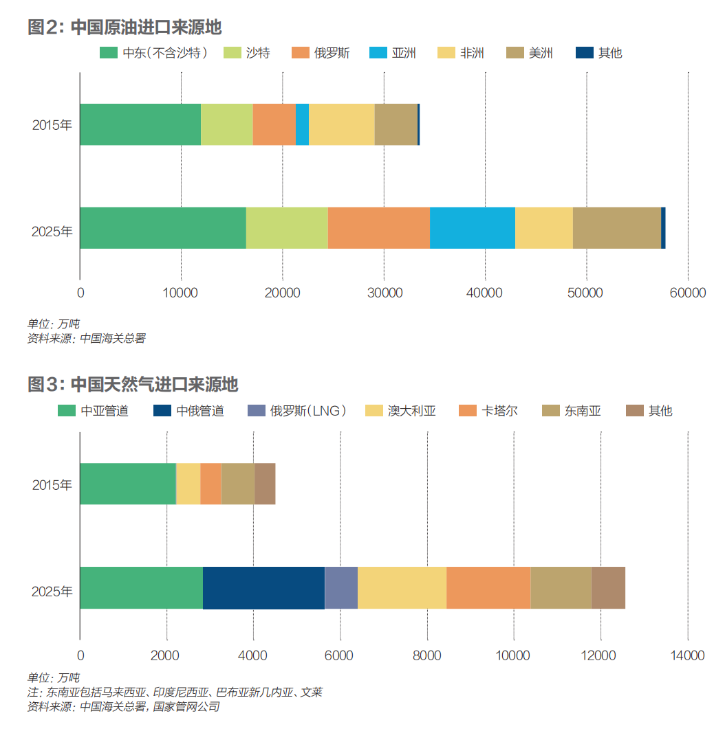 2025年中国的原油进口量相比2015年大幅增加72%,但来源已更加多元,中东地区的占比从50.7%下降至42.3%,俄罗斯、亚洲和美洲等区域的份额增加。2025年天然气进口量是2015年1.7倍,陆上管道进口气占比45%,海运液化天然气(LNG)则分布于澳大利亚、卡塔尔和东南亚地区。