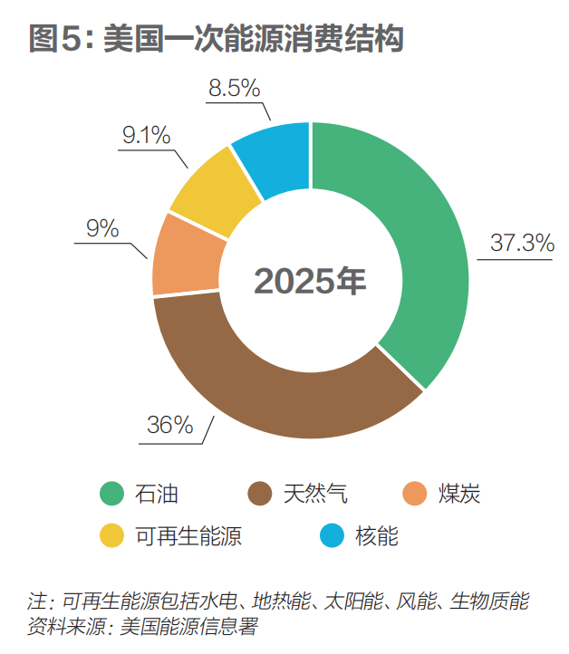 石油和天然气占据美国能源消费结构的绝对主力。2025年,美国一次能源消费结构里,石油和天然气各占36%以上,煤炭、可再生能源和核电占比接近,三者各约为9%左右。