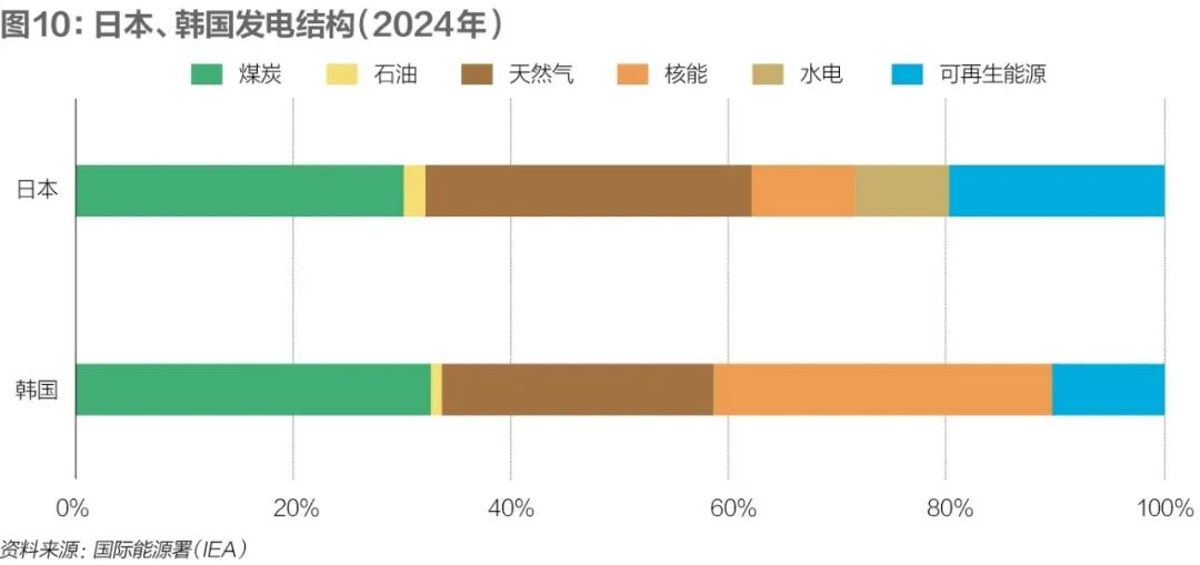 与日本类似,韩国也高度依赖化石能源进口,有约61%的原油进口与54%的石脑油进口依赖霍尔木兹航线;中东战事爆发至今,韩国炼厂开工率平均下降约10%,国内石脑油供给下滑10%-20%。根据IEA统计,2024年,化石能源在韩国能源消费总量中的占比将近80%,可再生能源占比不到4%。发电结构中,核电占比达31%,承担基荷供电功能。