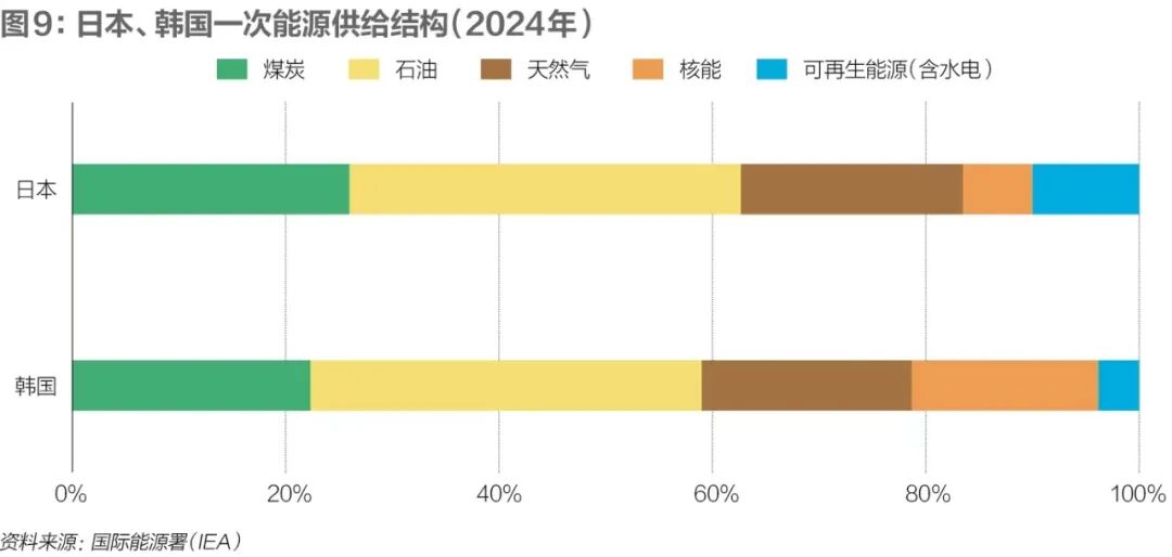 作为典型的资源匮乏型国家,日本和韩国长期高度依赖进口能源。根据IEA数据,两国能源自给率均低于20%(日本13%,韩国19%),石油和天然气几乎全靠进口。