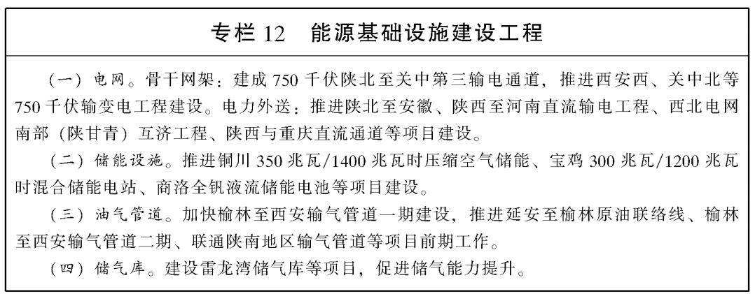 在加强能源基础设施建设方面,打造坚强电网,加快750千伏陕北至关中第四输电通道和陕南环网工程建设,构建“四纵双环”骨干网架,持续推进西安、榆林等电网攻坚补强,优化330千伏电网结构,加强110千伏及以下配电网改造升级。