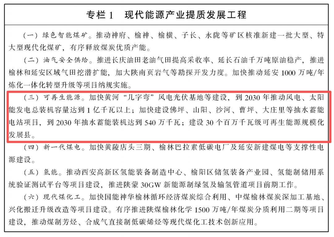 具体而言,加快黄河“几字弯”风电光伏基地等建设,到2030年推动风电、太阳能发电总装机容量达到1亿千瓦以上;到2030年抽水蓄能装机达到540万千瓦;建设30个百万千瓦级可再生能源规模化发展县;推动西安高新区氢能装备制造中心、榆阳区储氢装备产业园、氢能制储用系统验证测试平台等项目建设,推进陕蒙30GW新能源制绿氢及输氢管道项目前期工作。