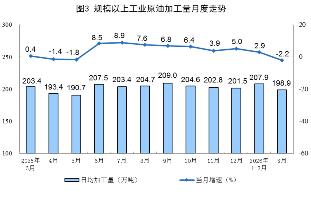 原油加工由增转降。3月份,规上工业原油加工量6167万吨,同比下降2.2%;日均加工198.9万吨。