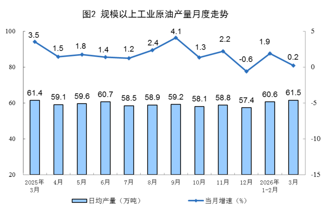 原油生产保持增长。3月份,规上工业原油产量1907万吨,同比增长0.2%;日均产量61.5万吨。