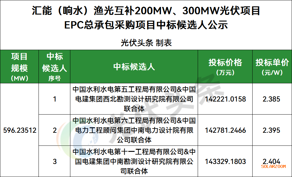 中国水利水电第五工程局有限公司&中国电建集团西北勘测设计研究院有限公司联合体、中国水利水电第六工程局有限公司&中国电力工程顾问集团中南电力设计院有限公司联合体、中国水利水电第十一工程局有限公司&中国电建集团中南勘测设计研究院有限公司联合体入围,投标单价2.385~2.404元/W。