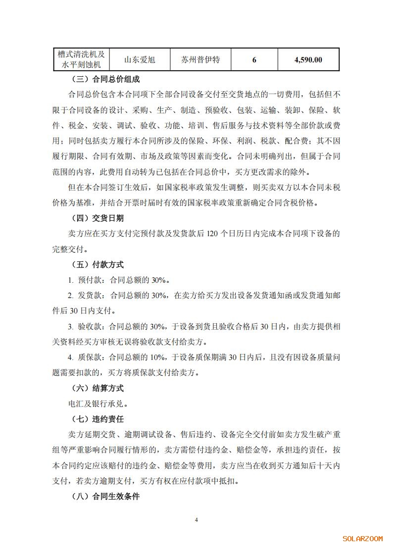公告显示,爱旭股份下属子公司山东爱旭太阳能科技有限公司(以下简称“山东爱旭”)拟与苏州普伊特自动化系统有限公司(以下简称“苏州普伊特”)签署《设备采购合同》,向其采购光伏电池片湿法生 产设备共计 6 套(10 台),合同总金额为 4,590.00 万元(含税)。