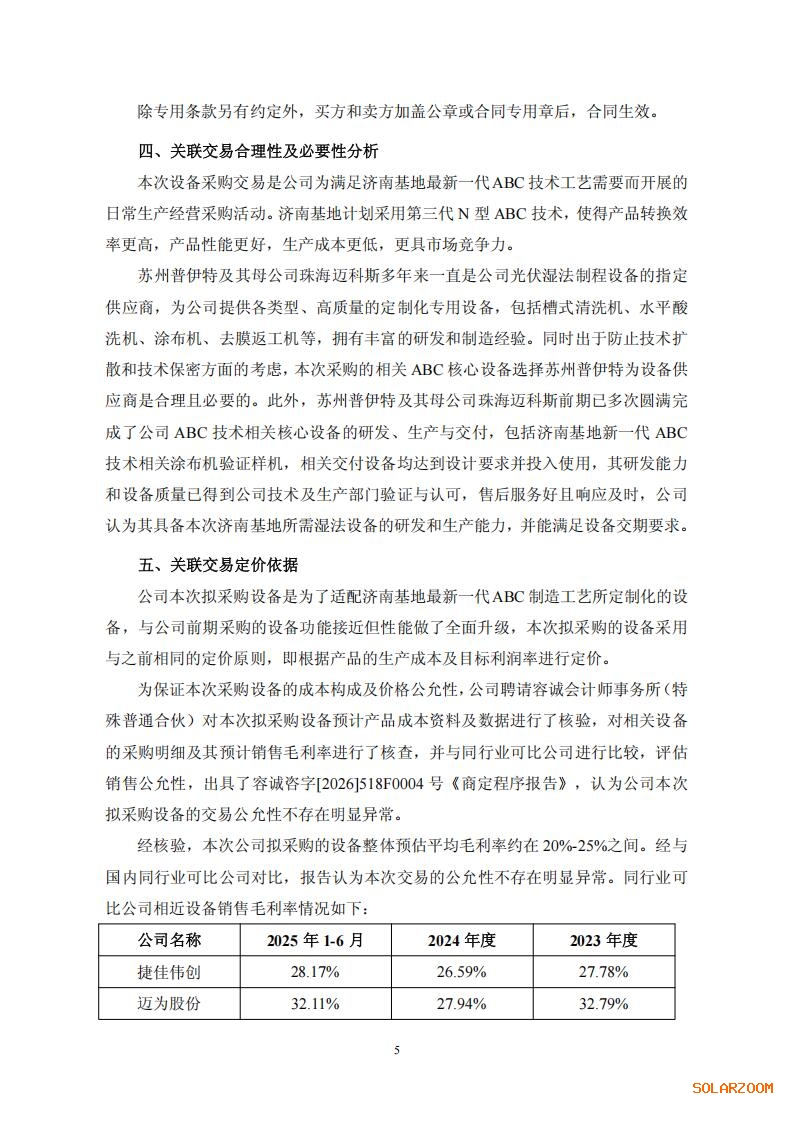 爱旭股份表示,苏州普伊特及其母公司珠海迈科斯多年来一直是公司光伏湿法制程设备的指定供应商,为公司提供各类型、高质量的定制化专用设备,包括槽式清洗机、水平酸洗机、涂布机、去膜返工机等,拥有丰富的研发和制造经验。同时出于防止技术扩散和技术保密方面的考虑,本次采购的相关 ABC 核心设备选择苏州普伊特为设备供应商是合理且必要的。