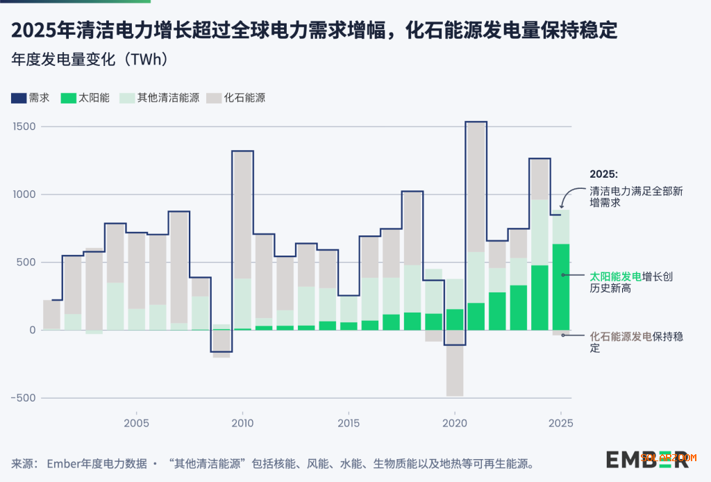 Ember董事总经理阿迪蒂亚·洛拉(Aditya Lolla)对此表示:“我们已坚定迈入清洁增长时代。清洁能源目前的扩张速度足以满足全球不断上升的电力需求。这已不再是愿景,而正在成为结构性的现实。”