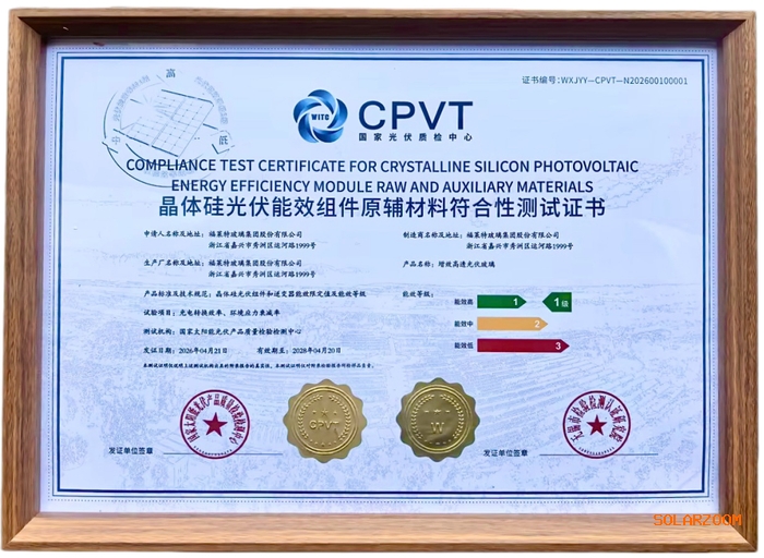 值得关注的是,这是CPVT在光伏玻璃领域出具的首份能效符合性专项证书,该证书于2026年4月21日正式颁发。